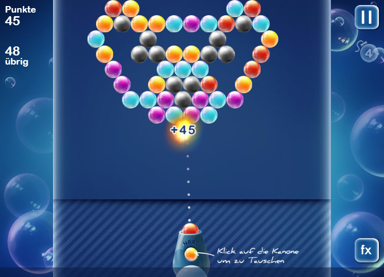 Mit welcher Farbe ihr als n chstes schie t, seht ihr am unteren Spielfeldrand in der Mitte. Diese zuf llig generierten Screens sorgen f r Abwechslung und hohe Spieltiefe und machen dar ber hinaus den Wiederspielwert des Browsergames aus.